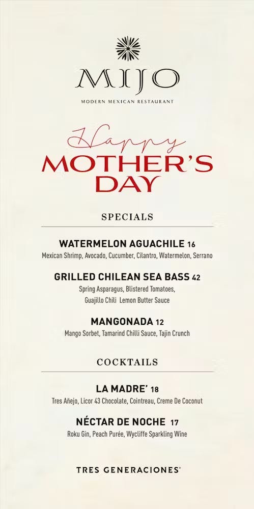 Mijo's culinary team has crafted a special menu to delight your senses and make Mother's Day truly special. These specials are available for both brunch and dinner on May 10th and 11th.